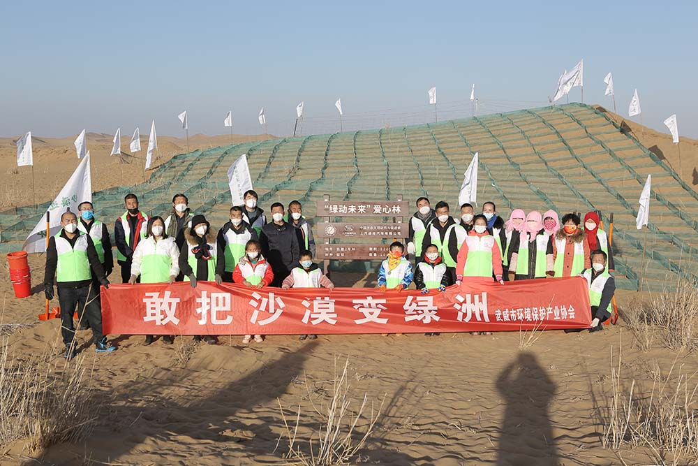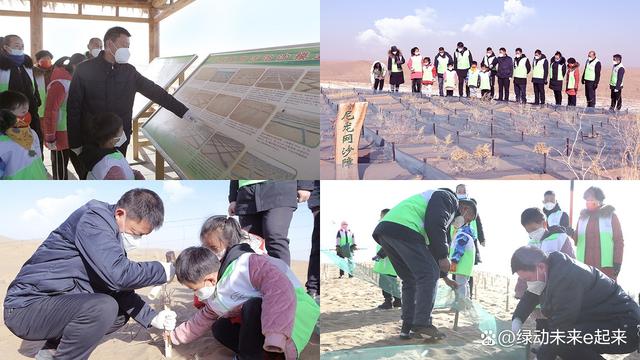 為弘揚(yáng)民勤防沙治沙精神,鼓勵(lì)公眾參與助力當(dāng)?shù)厣鷳B(tài)持續(xù)改善,2022年12月24日,十余組甘肅當(dāng)?shù)刂驹刚撸谖渫协h(huán)境保護(hù)產(chǎn)業(yè)協(xié)會(huì)和“綠動(dòng)未來(lái)”平臺(tái)的帶領(lǐng)下,前往騰格里沙漠。大家與治沙英雄石述柱之子石光明一起,探視并養(yǎng)護(hù)了“綠動(dòng)未來(lái)”民勤1號(hào)林,近距離觀摩學(xué)習(xí)了“民勤模式”科學(xué)治沙技術(shù),并將所學(xué)轉(zhuǎn)化為切實(shí)的植樹(shù)成果,攜手在騰格里沙漠再植10,000余棵梭梭樹(shù)苗,落成又一片“綠動(dòng)未來(lái)”愛(ài)心林。